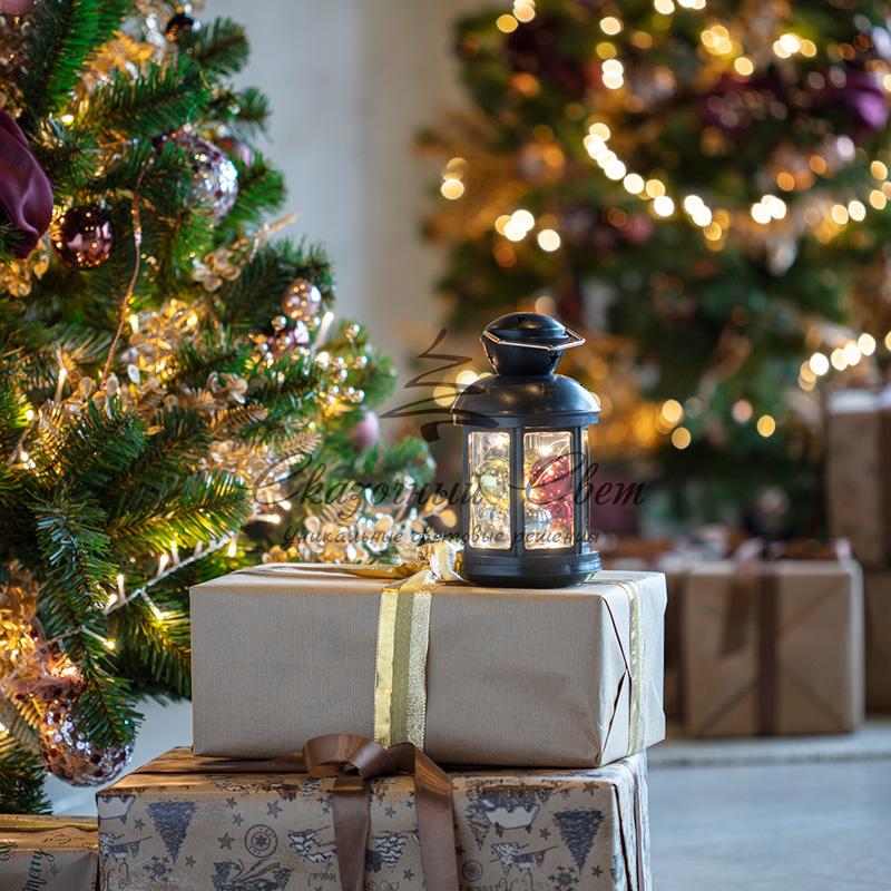 Декоративный фонарь с шариками олицетворяет тепло и домашний уют в преддверии Нового года, помогает сделать домашние вечера в кругу семьи комфортными и поднимает настроение окружающим. Оригинальное изделие в корпусе черного цвета станет стильным дополнением праздничной обстановки. Для подвешивания предусмотрено кольцо в верхней части. Экономичные диоды, подсвечивающие композицию, излучают теплый белый свет. В качестве элементов питания используются 2 батарейки типа АА, которые делают фонарь мобильным — для работы не нужна розетка.