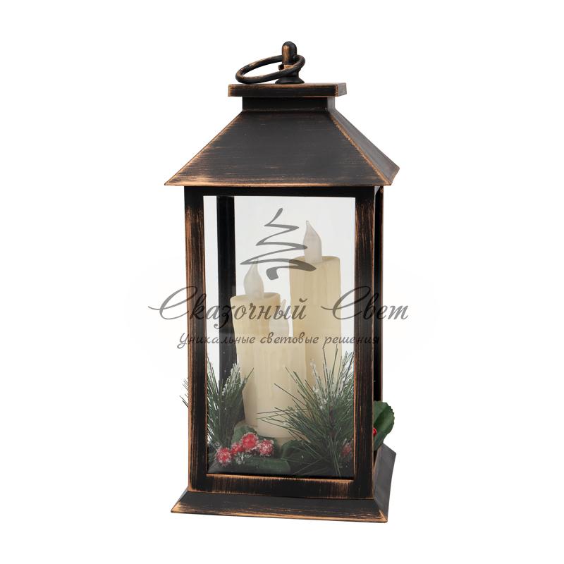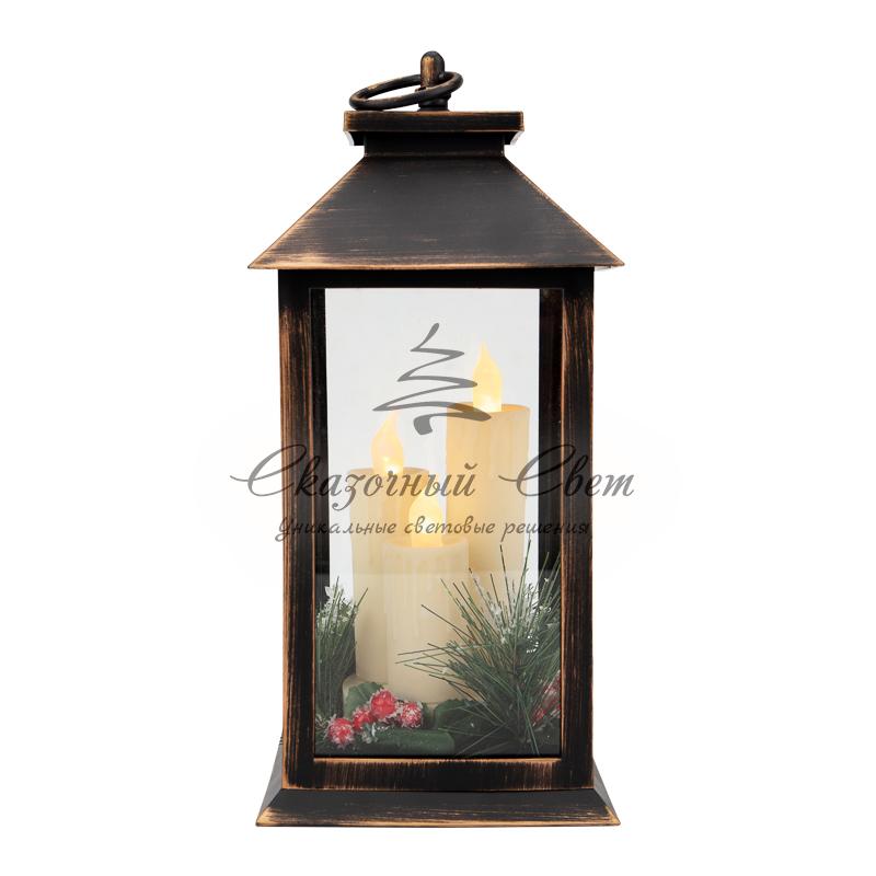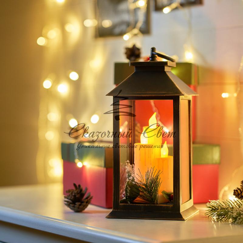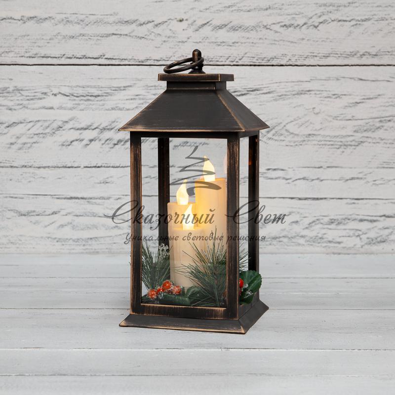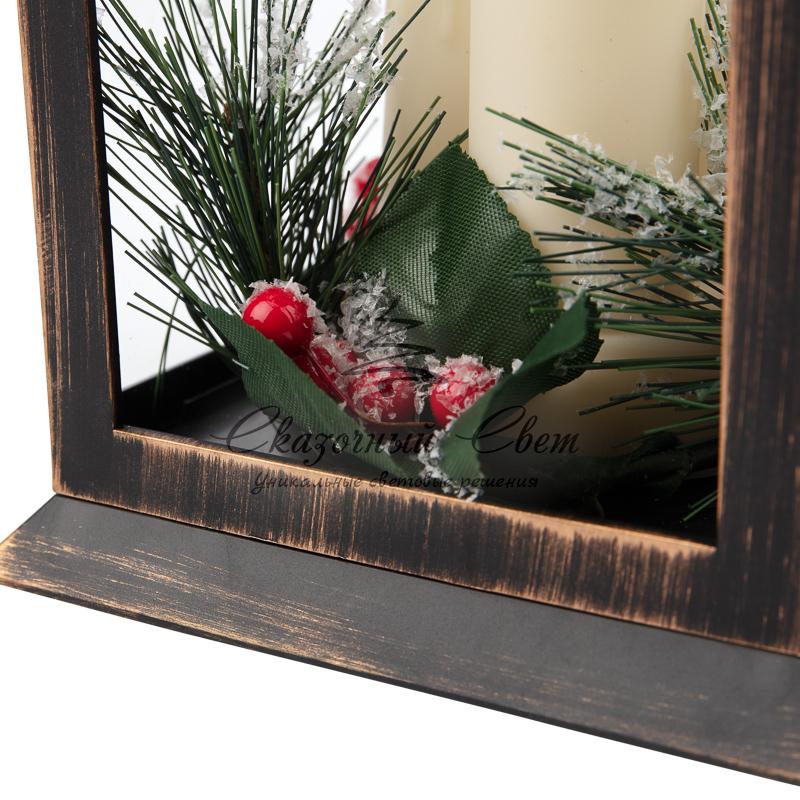 Декоративный фонарь со свечкой и шишкой, бронзовый корпус, размер 14x14x27 см, цвет теплый белый купить в интернет-магазине Сказочный свет