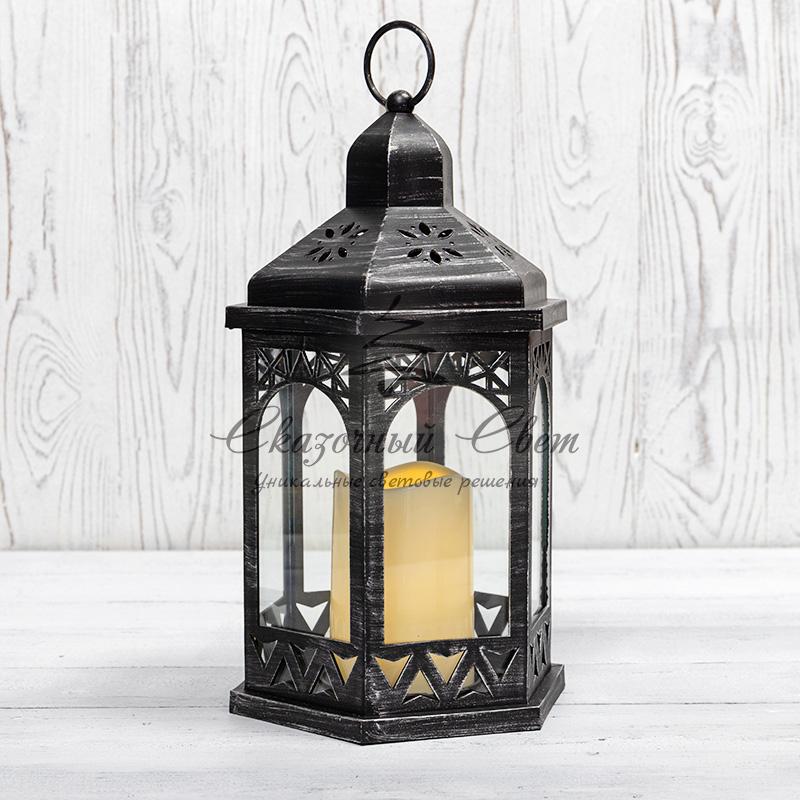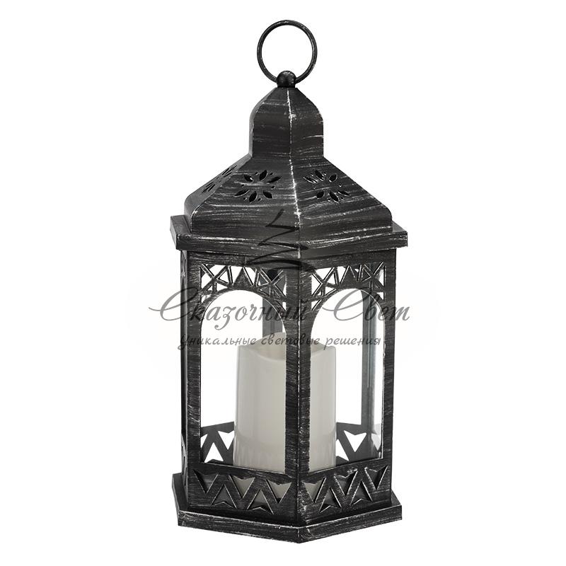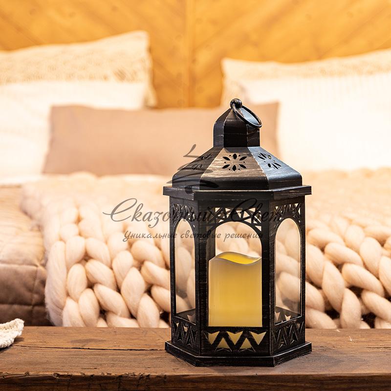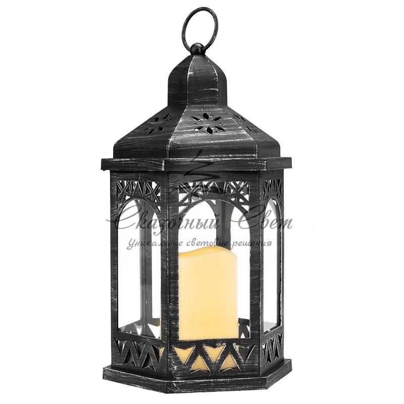 Декоративный фонарь со свечкой в корпусе черного цвета — стильное интерьерное украшение, которое создает уют и ощущение тепла в долгие зимние вечера. Резные элементы, обрамляющие стекла, усиливают эффект аутентичности: изделие напоминает старинный подвесной фонарь, а пластиковая свечка со светодиодом имитирует ровное желтое пламя. Изделие питается от 3 батареек типа ААА и предназначено для использования в сухих отапливаемых помещениях. На корпусе есть кнопка ON|OFF для включения и выключения подсветки.