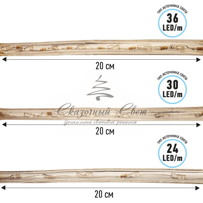 Дюралайт-гибкий световой шнур выполненный из ПВХ трубки с токопроводящими жилами и светодиодами внутри. Используется для декоративной и архитектурной подсветки объектов. Шнур с 2-мя проводами внутри называется фиксинг, такой дюралайт используется в режиме постоянного свечения. Дюралайт с 3-мя и более жилами питания называется чейзинг, светодиоды в чейзинге подключены поочередно к разным жилам, при использовании контроллера это позволяет создавать эффект «бегущей волны» из поочередно загорающихся светодиодов(режим свечения с динамикой). Дюралайт поставляется в бухтах длинами до 100м, в зависимости от модификации дюралайта модуль резки может составлять от 1 до 6 метров, следуя несложной инструкции потребитель легко может отрезать и подключить отрезок дюралайта нужной ему длины. Каждая бухта уже укомплектована 1 шнуром для подключения, максимальная подключаемая длина 100м. Дополнительные шнуры можно приобрести отдельно арт. 124-021. Для работы в светодинамическом режиме необходим контроллер арт. 124-032 или арт. 124-034. Температурный диапазон использования от -40 до +50 С, монтаж при температуре выше 0 градусов. Дополнительно предлагаются контроллеры для дюралайта фиксинг и чейзинг мощностью от 24 до 340 Вт, что позволяет подключить в одну цепь до 140 метров.