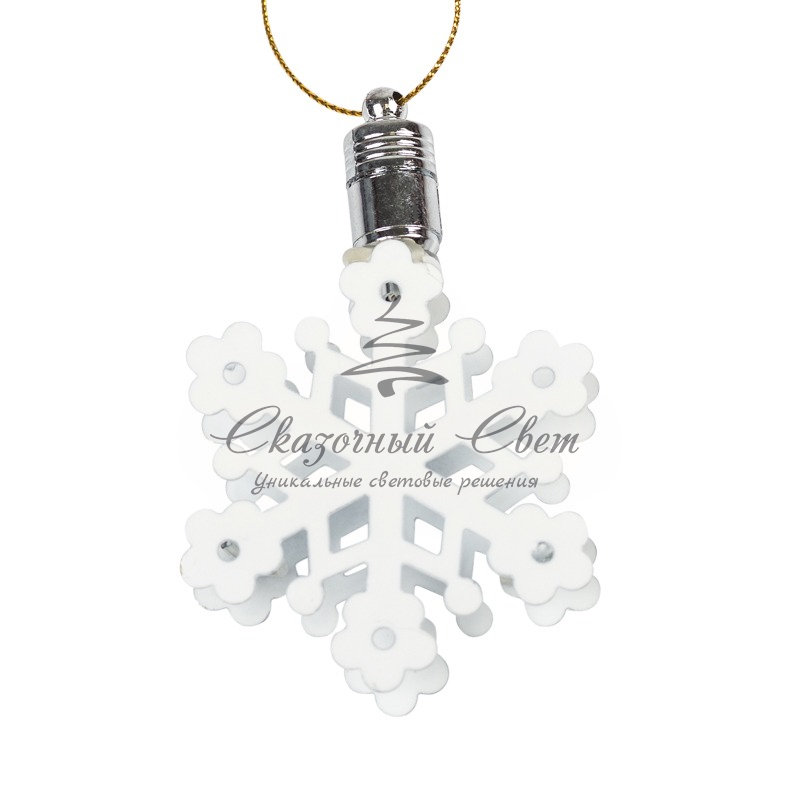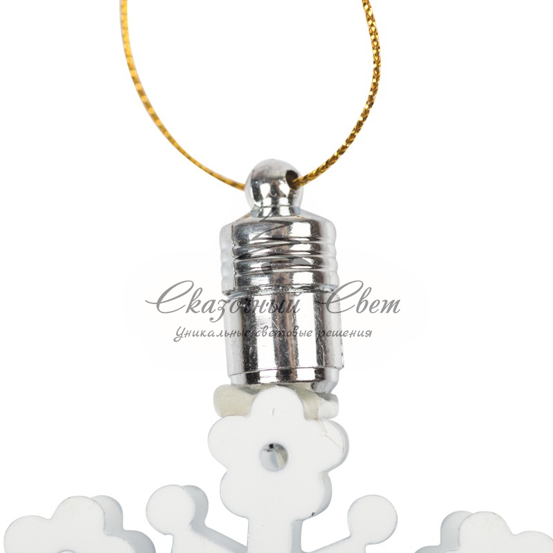 Светодиодная подвесная фигурка «Снежинка» 6×6 см — яркий, современный, безопасный интерьерный декор, который станет прекрасной альтернативой обычным елочным игрушкам. Изделие с эффектной подсветкой подвешивается при помощи тонкого шнурка, прикрепленного к металлической гильзе. Внутри блока находятся 3 батарейки типа LR41. Независимость от розетки позволяет украсить любой уголок вашего дома, а экономичность светодиода RGB дает возможность надолго забыть о периодической замене элементов питания. В цветовой гамме свечения более 256 вариантов.