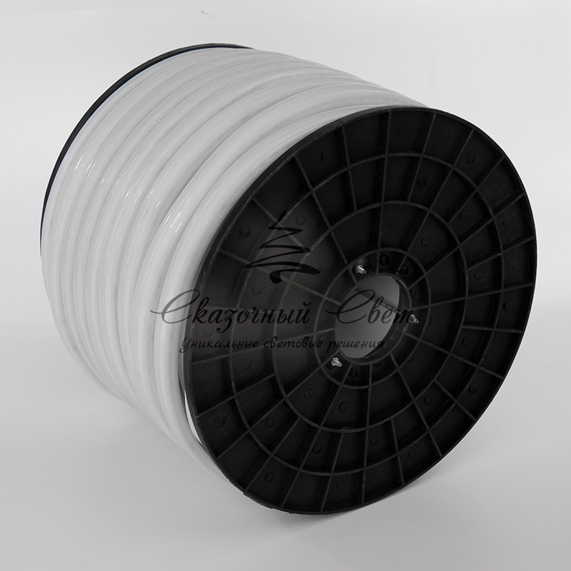 Гибкий неон — световой шнур выполненный из матовой красной ПВХ трубки с токопроводящими жилами и светодиодами внутри. Используется для декоративной и архитектурной подсветки объектов, так же широко распространён в украшении интерьера. Шнур имеет два токопроводящих провода внутри и используется в режиме постоянного свечения. Данный вид гибкого неона имеет угол свечения 360 градусов благодаря равномерному расположению светодиодов внутри ПВХ трубки. Гибкий неон поставляется в бухтах длиной 50 м, имеет модуль резки 1,13 метра. Следуя несложной инструкции легко можно отрезать и подключить гибкий неон нужной длины. Температурный диапазон использования от -45 до +35 оС, монтаж необходимо производить при температуре -25 до +35 оС. Допустимый диаметр изгиба составляет 3 см.