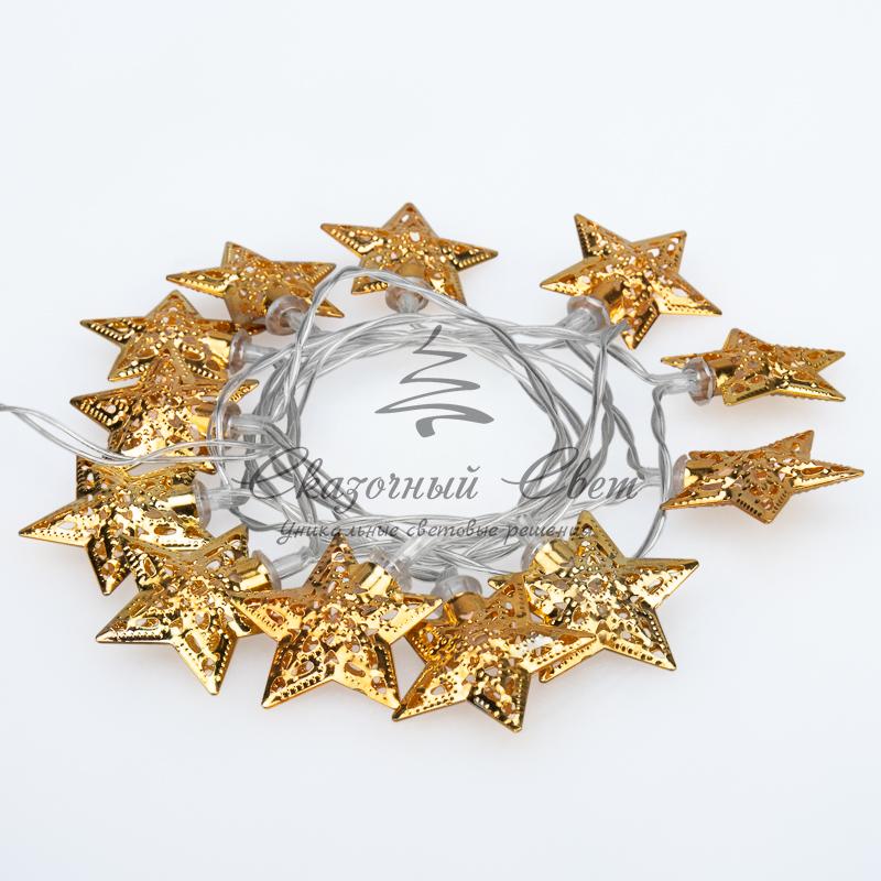 Светодиодная гирлянда «Звезды» питается от солнечной батареи. На проводе, помещенном в прозрачную изоляцию из ПВХ, находятся 12 диодов, которые выполнены в виде ажурных звезд золотистого цвета с глянцевым покрытием. Экономичные безопасные диоды излучают белый свет теплого оттенка. На питающем элементе предусмотрен блок управления с клавишей включения, выключения и смены режима на динамичный — удобное решение, когда гирлянда не используется. Защита IP44 допускает использование на улице.