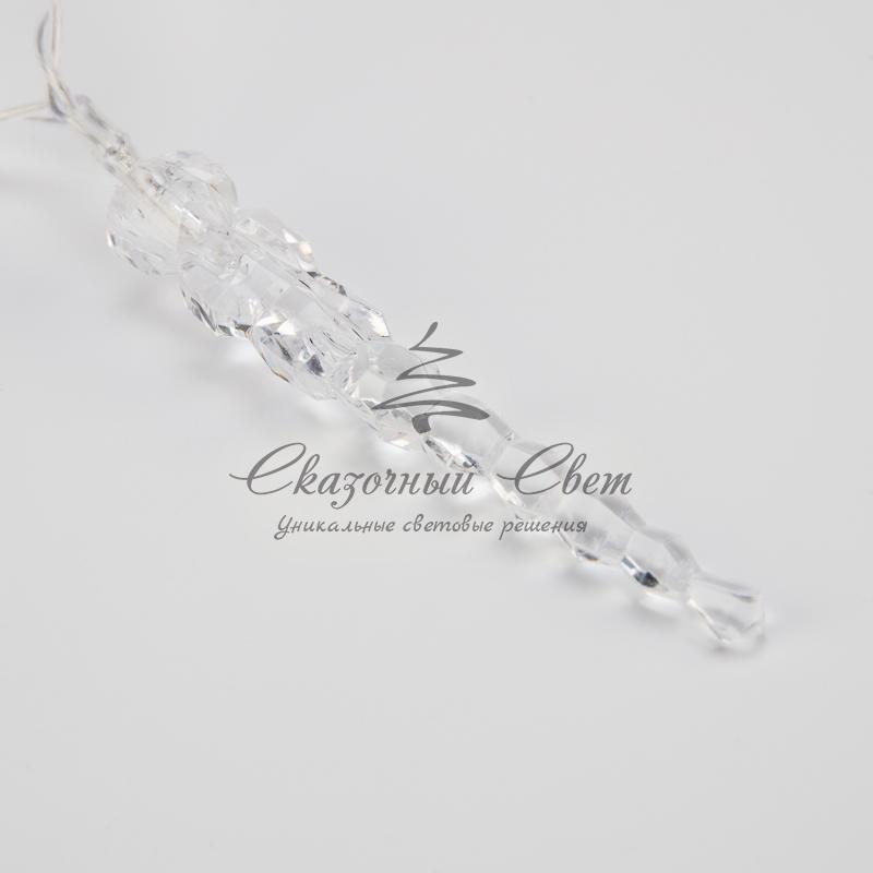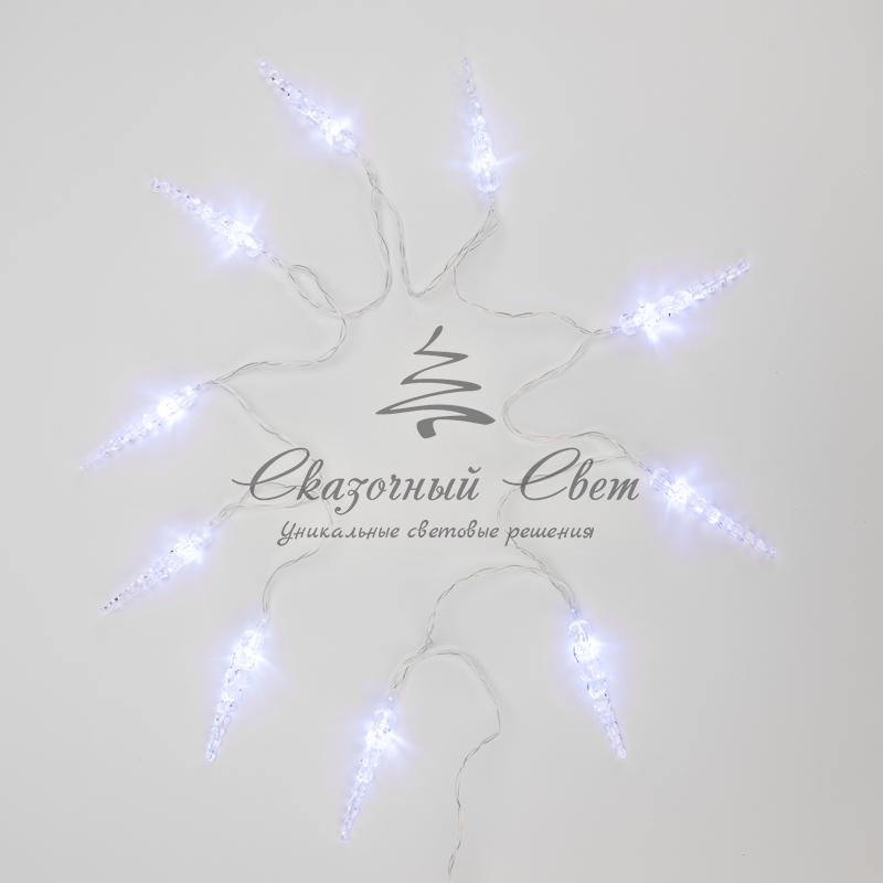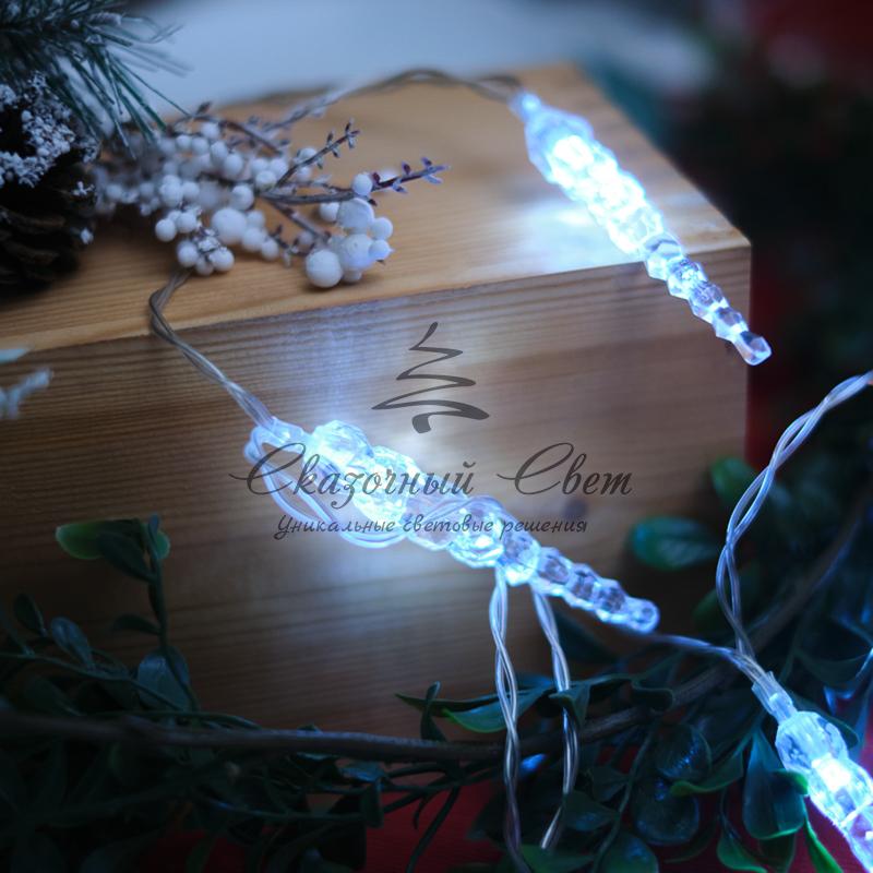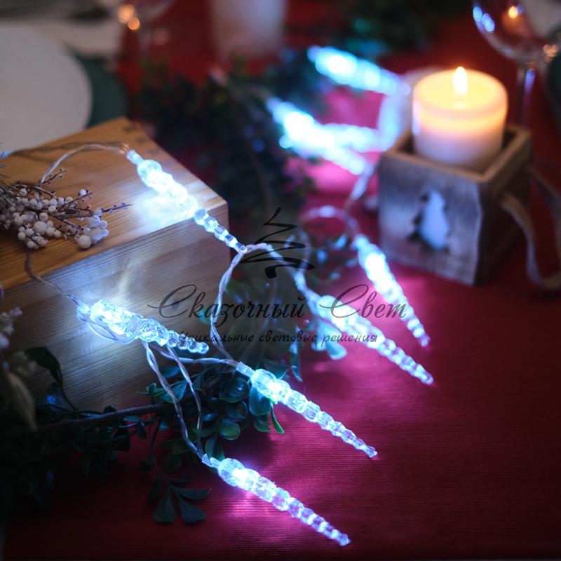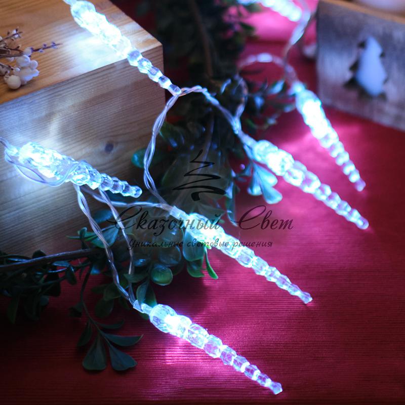 Светодиодная гирлянда «Сосульки» длиной 1,5 метра украшена пластиковыми насадками в виде ледяных сосулек, которые ярко подсвечиваются диодами. Украшение способствует созданию магической атмосферы праздника и помогает эффектно оформить интерьер. 10 сосулек расположены на расстоянии 16 сантиметров друг от друга, в качестве основы используется электрический кабель в надежной изоляции из прозрачного ПВХ. Диоды белого свечения питаются от двух батареек АА, которые помещаются в небольшой блок на конце кабеля. Безопасное изделие на батарейках — прекрасный вариант для оформления детской комнаты.