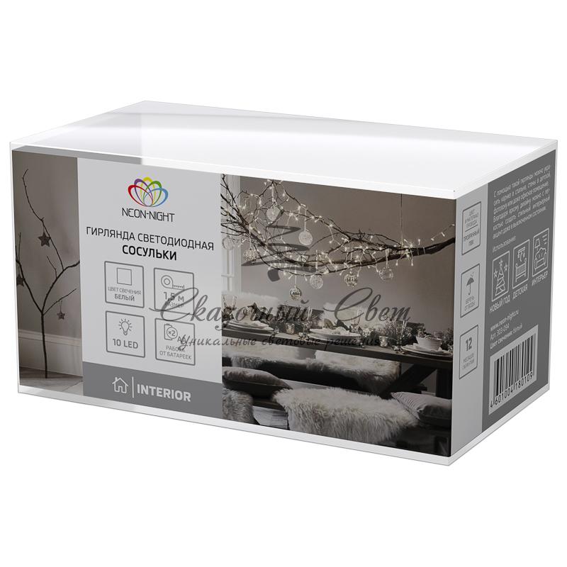 Гирлянда светодиодная «Сосульки» 1.5 м, 10 LED, прозрачный ПВХ, цвет свечения белый, 2 х АА (батарейки не в комплекте) NEON-NIGHT купить в интернет-магазине Сказочный свет