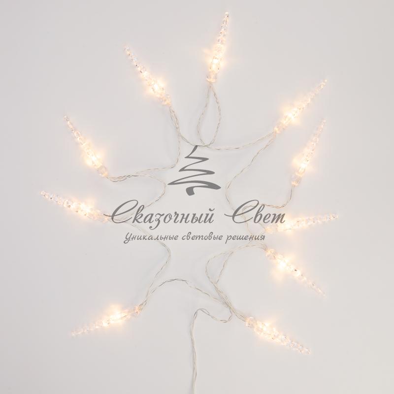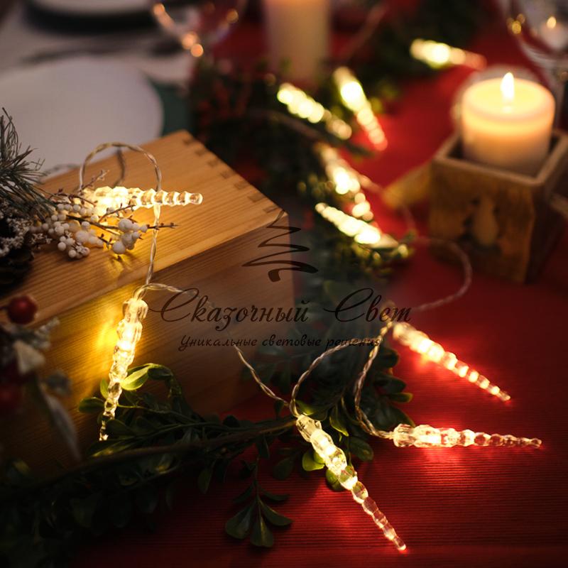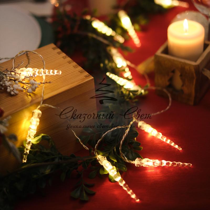 Светодиодная гирлянда «Сосульки» длиной 1,5 метра — идеальное решение для создания праздничного декора в преддверии Нового года. 10 насадок в виде сосулек ярко подсвечиваются диодами, которые излучают теплый белый свет. Необычный дизайн, тематическое исполнение, независимость от электрической сети и абсолютная безопасность открывают большие возможности в оформлении интерьера. Гирлянда питается от двух элементов типа АА, для которых предусмотрен отдельный блок с крышкой и клавишей ON|OFF. Изделие IP20 предназначено для использования дома, в офисе, магазине и других помещениях со стандартными условиями.