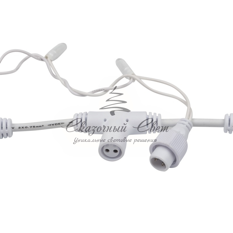 Гирлянда «Светодиодный Дождь» представляет собой гибкий горизонтальный шнур-шину (2м), к которому через определенные промежутки крепятся вертикальные нити (20 шт.) со светодиодными лампами, которые отличаются от «Бахромы» тем, что имеют одинаковую, достаточно значительную длину, часто превышающую протяженность шины. На концах каждой шины есть разъем и штепсель, которые предназначены для последовательного соединения нескольких световых дождей в большой занавес ПЛЕЙ-ЛАЙТ. Используя занавес, можно не только создавать красивые световые занавесы или оформлять различные плоскости, например, фасады домов, окна и т.д., но и украшать объемные объекты.