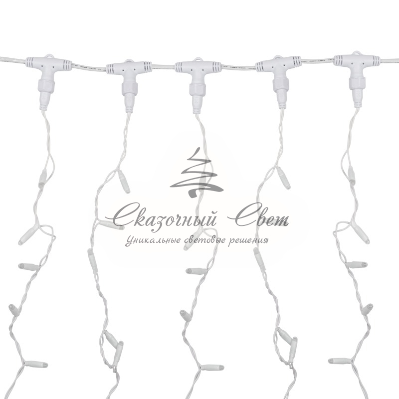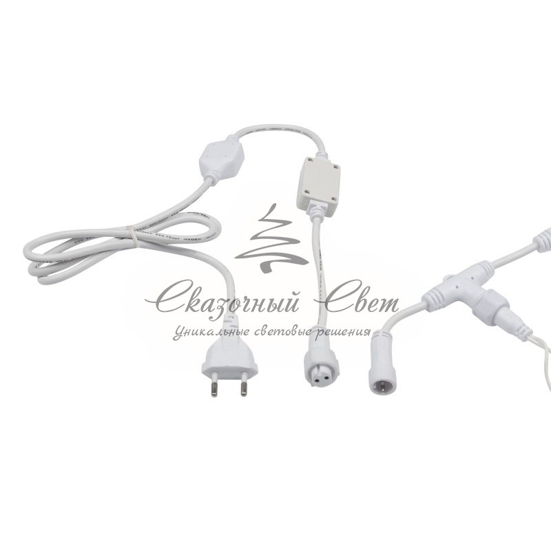 Гирлянда «Светодиодный Дождь» представляет собой гибкий горизонтальный шнур-шину (2м), к которому через определенные промежутки крепятся вертикальные нити (20 шт.) со светодиодными лампами, которые отличаются от «Бахромы» тем, что имеют одинаковую, достаточно значительную длину, часто превышающую протяженность шины. На концах каждой шины есть разъем и штепсель, которые предназначены для последовательного соединения нескольких световых дождей в большой занавес ПЛЕЙ-ЛАЙТ. Используя занавес, можно не только создавать красивые световые занавесы или оформлять различные плоскости, например, фасады домов, окна и т.д., но и украшать объемные объекты.