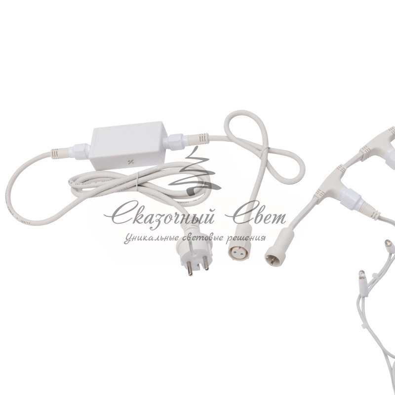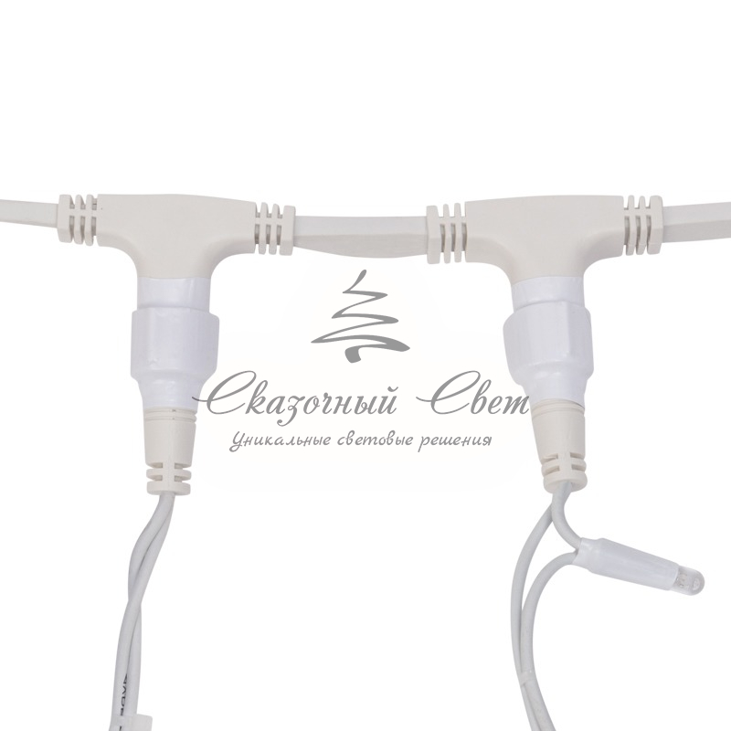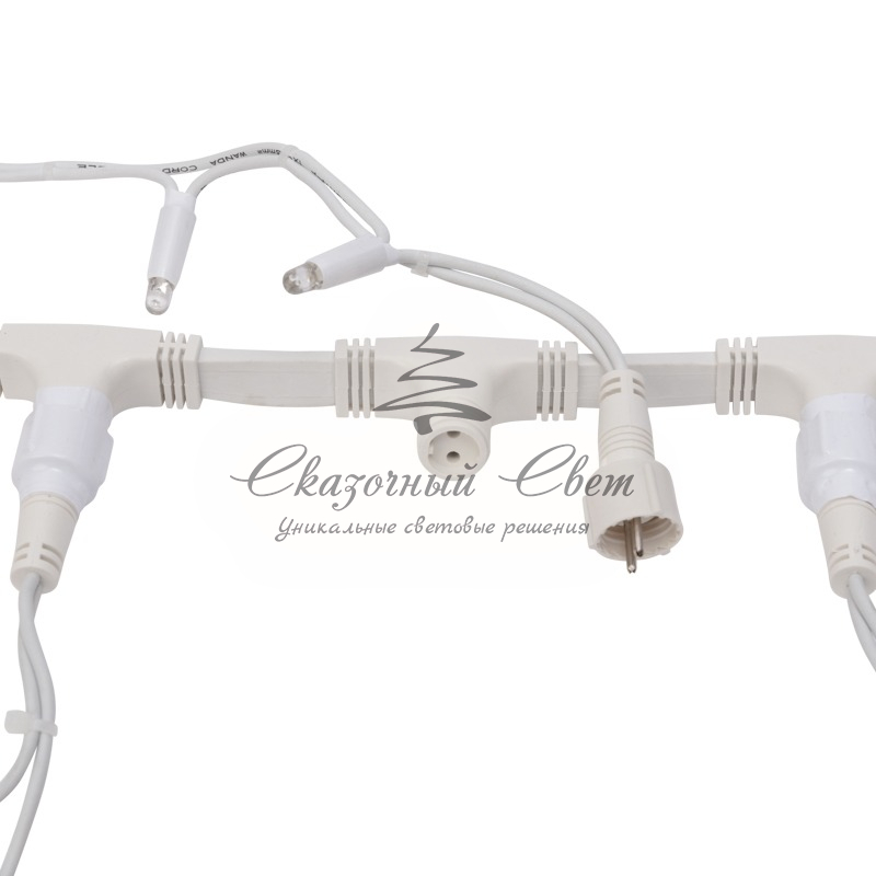 ирлянда «Светодиодный Дождь» представляет собой гибкий горизонтальный шнур, к которому через определенные промежутки крепятся вертикальные нити со светодиодными лампами, которые отличаются от «Бахромы» тем, что имеют одинаковую, достаточно значительную длину, часто превышающую протяженность шины. На концах каждой шины есть разъем и штепсель, которые предназначены для последовательного соединения нескольких световых дождей в большой занавес ПЛЕЙ-ЛАЙТ. Используя занавес, можно не только создавать красивые световые занавесы или оформлять различные плоскости, например, фасады домов, окна и т.д., но и украшать объемные объекты.