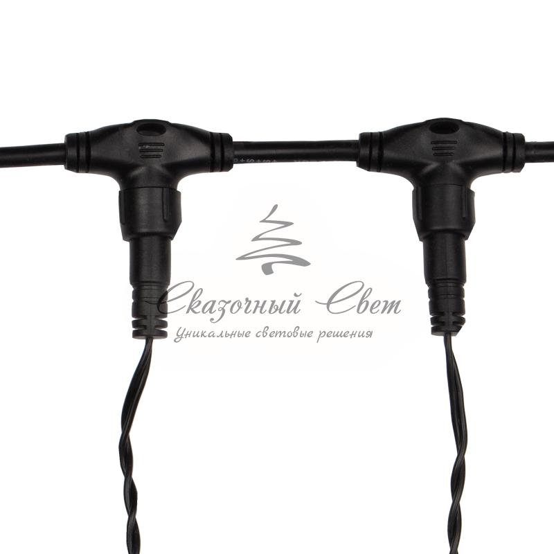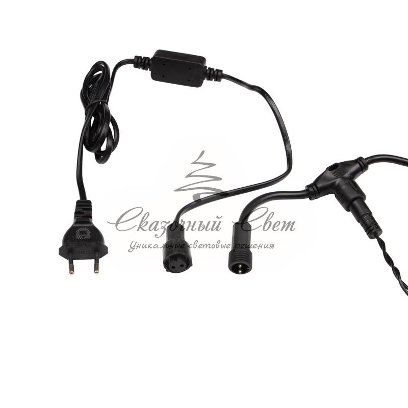 Гирлянда «Светодиодный Дождь» представляет собой гибкий горизонтальный шнур-шину (2м), к которому через определенные промежутки крепятся вертикальные нити (20 шт.) со светодиодными лампами, которые отличаются от «Бахромы» тем, что имеют одинаковую, достаточно значительную длину, часто превышающую протяженность шины. На концах каждой шины есть разъем и штепсель, которые предназначены для последовательного соединения нескольких световых дождей в большой занавес ПЛЕЙ-ЛАЙТ. Используя занавес, можно не только создавать красивые световые занавесы или оформлять различные плоскости, например, фасады домов, окна и т.д., но и украшать объемные объекты. Гирлянду, работающую в непрерывном свечении, называют фиксинг, а использующую режим светодинамики – чейзинг. Светодинамические эффекты становятся доступными только при подключении гирлянды к сети через специальный контроллер. Сегодня в гирляндах источником света служат светодиоды, которые пришли на смену применявшимся ранее лампам накаливания. С полупроводниковыми источниками гирлянда стала более надежной, потребляет меньше энергии, обрела более насыщенное сияние. Данная гирлянда имеет желтый цвет свечения светодиодов.