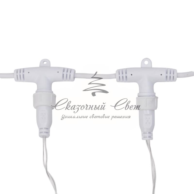 Гирлянда «Светодиодный Дождь» представляет собой гибкий горизонтальный шнур-шину (2м), к которому через определенные промежутки крепятся вертикальные нити (20 шт.) со светодиодными лампами, которые отличаются от «Бахромы» тем, что имеют одинаковую, достаточно значительную длину, часто превышающую протяженность шины. На концах каждой шины есть разъем и штепсель, которые предназначены для последовательного соединения нескольких световых дождей в большой занавес ПЛЕЙ-ЛАЙТ. Используя занавес, можно не только создавать красивые световые занавесы или оформлять различные плоскости, например, фасады домов, окна и т.д., но и украшать объемные объекты. Гирлянду, работающую в непрерывном свечении, называют фиксинг, а использующую режим светодинамики – чейзинг. Светодинамические эффекты становятся доступными только при подключении гирлянды к сети через специальный контроллер. Сегодня в гирляндах источником света служат светодиоды, которые пришли на смену применявшимся ранее лампам накаливания. С полупроводниковыми источниками гирлянда стала более надежной, потребляет меньше энергии, обрела более насыщенное сияние. Данная гирлянда имеет теплый белый цвет свечения светодиодов.