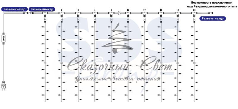 Гирлянда «Светодиодный Дождь» представляет собой гибкий горизонтальный шнур-шину (2м), к которому через определенные промежутки крепятся вертикальные нити (20 шт.) со светодиодными лампами, которые отличаются от «Бахромы» тем, что имеют одинаковую, достаточно значительную длину, часто превышающую протяженность шины. На концах каждой шины есть разъем и штепсель, которые предназначены для последовательного соединения нескольких световых дождей в большой занавес ПЛЕЙ-ЛАЙТ. Используя занавес, можно не только создавать красивые световые занавесы или оформлять различные плоскости, например, фасады домов, окна и т.д., но и украшать объемные объекты. Гирлянду, работающую в непрерывном свечении, называют фиксинг, а использующую режим светодинамики – чейзинг. Светодинамические эффекты становятся доступными только при подключении гирлянды к сети через специальный контроллер. Сегодня в гирляндах источником света служат светодиоды, которые пришли на смену применявшимся ранее лампам накаливания. С полупроводниковыми источниками гирлянда стала более надежной, потребляет меньше энергии, обрела более насыщенное сияние. Данная гирлянда имеет синий цвет свечения светодиодов.