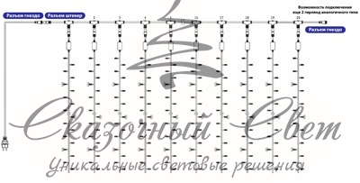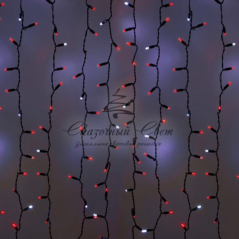 Гирлянда «Светодиодный Дождь» представляет собой гибкий горизонтальный шнур-шину (2м), к которому через определенные промежутки крепятся вертикальные нити (20 шт.) со светодиодными лампами, которые отличаются от «Бахромы» тем, что имеют одинаковую, достаточно значительную длину, часто превышающую протяженность шины. На концах каждой шины есть разъем и штепсель, которые предназначены для последовательного соединения нескольких световых дождей в большой занавес ПЛЕЙ-ЛАЙТ. Используя занавес, можно не только создавать красивые световые занавесы или оформлять различные плоскости, например, фасады домов, окна и т.д., но и украшать объемные объекты.