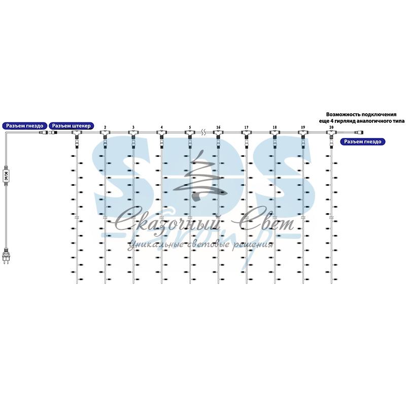 Гирлянда «Светодиодный Дождь» представляет собой гибкий горизонтальный шнур-шину (2м), к которому через определенные промежутки крепятся вертикальные нити (20 шт.) со светодиодными лампами, которые отличаются от «Бахромы» тем, что имеют одинаковую, достаточно значительную длину, часто превышающую протяженность шины. На концах каждой шины есть разъем и штепсель, которые предназначены для последовательного соединения нескольких световых дождей в большой занавес ПЛЕЙ-ЛАЙТ. Используя занавес, можно не только создавать красивые световые занавесы или оформлять различные плоскости, например, фасады домов, окна и т.д., но и украшать объемные объекты. Гирлянду, работающую в непрерывном свечении, называют фиксинг, а использующую режим светодинамики – чейзинг. Режим чейзинг имеет различные светодинамические эффекты. Данная гирлянда имеет эффект водопада. Сегодня в гирляндах источником света служат светодиоды, которые пришли на смену применявшимся ранее лампам накаливания. С полупроводниковыми источниками гирлянда стала более надежной, потребляет меньше энергии, обрела более насыщенное сияние. Данная гирлянда имеет белый цвет свечения светодиодов.