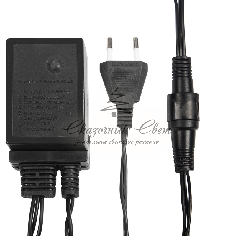 Гирлянда «Твинкл Лайт» представляет собой общий провод с последовательно расположенными коротенькими отводами, направленными в разные стороны. На концах этих «отростков» расположены яркие светодиоды. Для создания праздничной светодинамики в общий провод встроен многопрограммный контроллер, который позволяет управлять 8 режимами свечения.