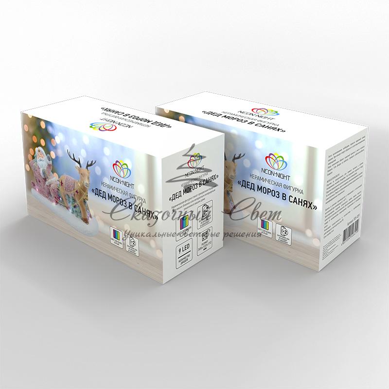 Керамическая фигурка «Дед Мороз в санях» 30.5×12.2×17.2 см — интерьерное украшение, которое можно разместить в любом уголке вашего дома, поскольку изделие не требует подключения к электрической розетке. 2 батарейки типа ААА устанавливаются в специальный блок в задней части конструкции. Кнопка ON|OFF позволяет быстро включать и выключать подсветку. Керамика — это безопасный, качественный материал, любимый многими за аутентичность. Фигурка покрыта нетоксичной краской, поверхность имеет приятную фактуру, имитирующую легкий иней на теплой шубке Деда Мороза.