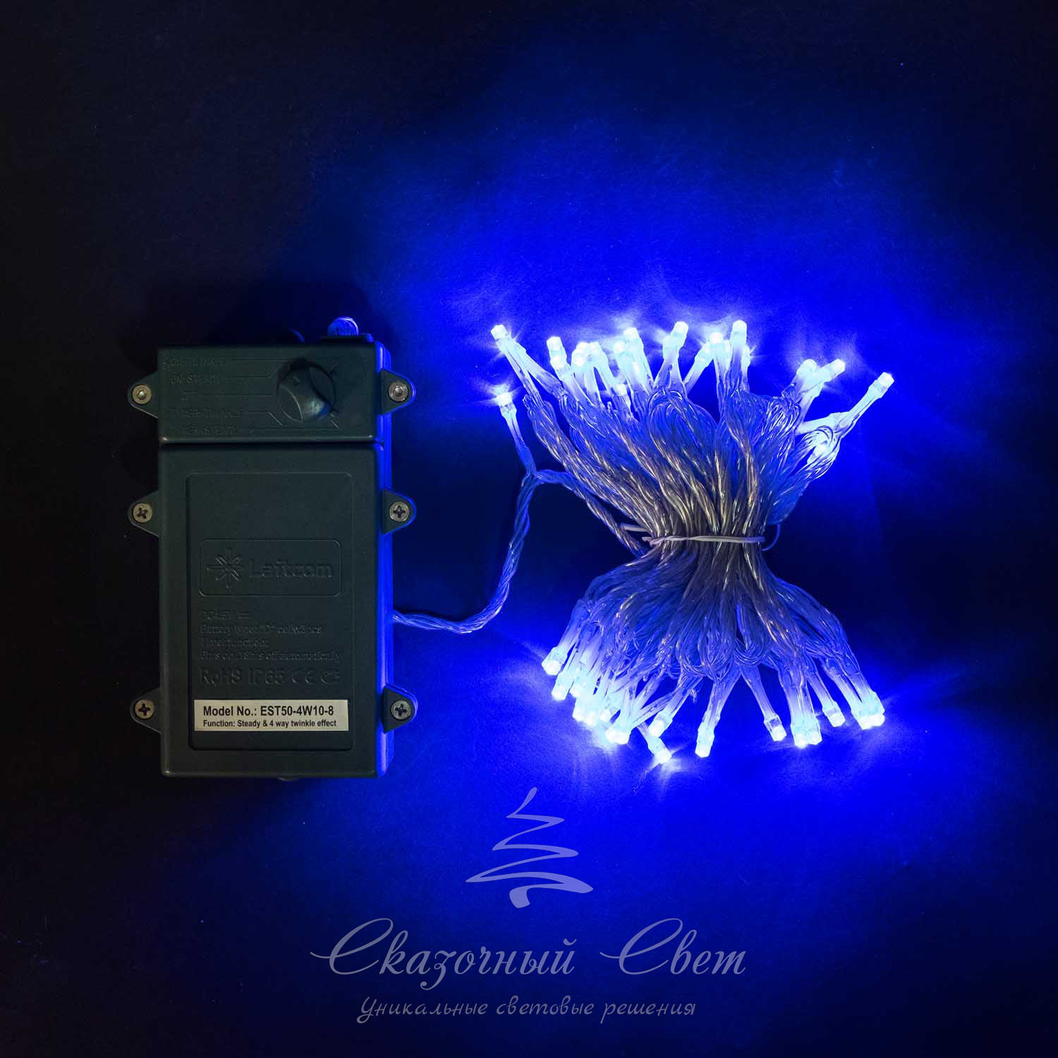 Нить на батарейках 5 м, 3 бат. "D", 4,5V, прозрачный провод, 50 led, синий купить в интернет-магазине Сказочный свет