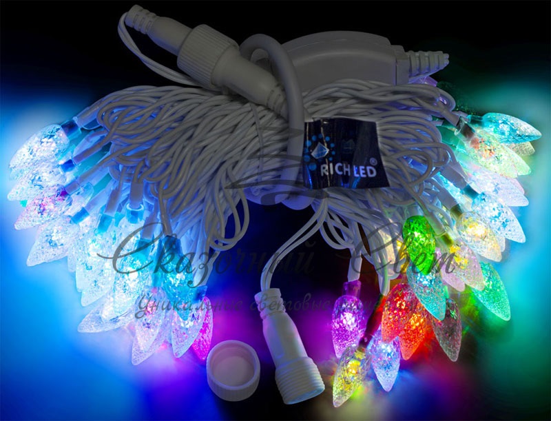 В линейке гирлянд шарики, есть некоторые разновидности, и одна из них это так называемые «Мультишарики» особенность которых заключается в том, что каждый шарик меняет цвет по своей программе, благодаря чему вся гирлянда мерцает разными цветами. Удобство использования шариков в том что мы получаем красивый светодинамический эффект за сравнительно не большую цену, без использования специальных внешних контроллеров, так как вся электроника уже встроена внутрь гирлянды. На сегодняшний день часто используют гирлянды, в которых цвет может меняться синхронно, это достигается при помощи использования контроллера, который позволяет менять программы светодинамических эффектов. Контроллер очень прост в использовании и имеет всего две кнопки, одна из которых отвечает за переключение самих эффектов, вторая управляет скоростью этих эффектов.