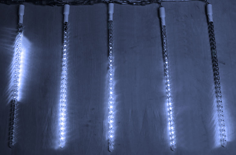 Гирлянда «Тающие сосульки» (Светодиодные сосульки) представляют собой пластиковые трубки со светодиодами, закрепленные на общем шнуре питания. Каждая трубка – с эффектом «падающей капли». Цвет светодиодов чаще всего белый или синий, но есть «Тающие сосульки» и с эффектом RGB-свечения.