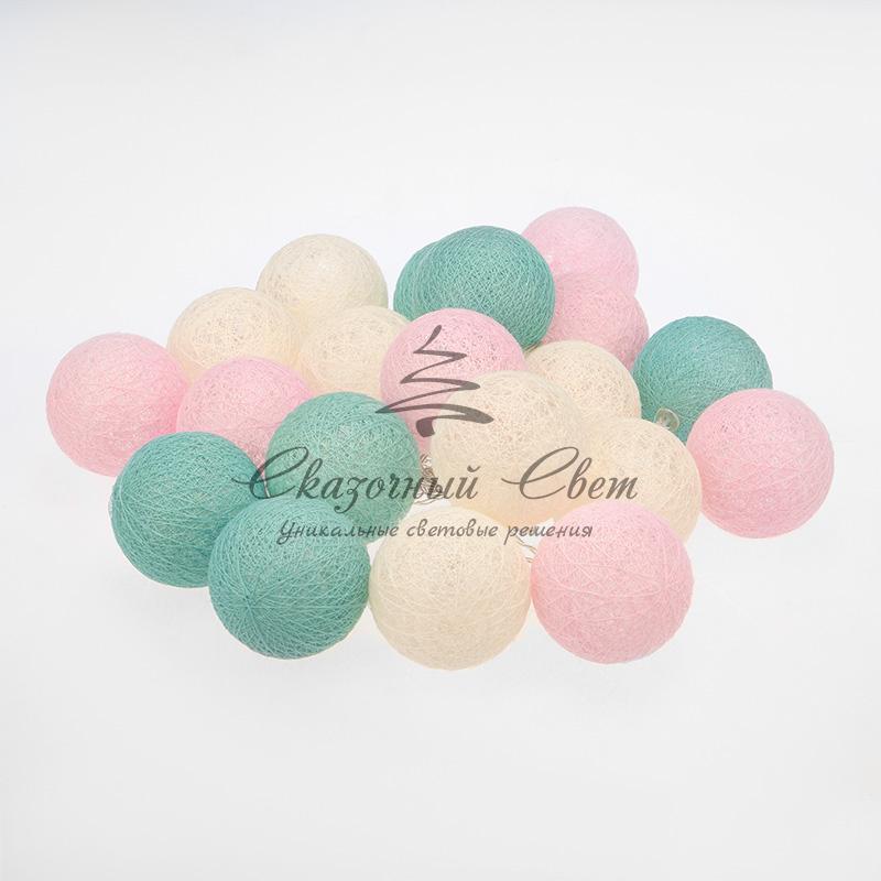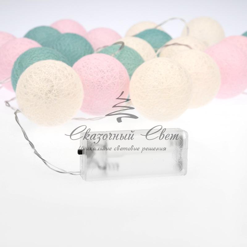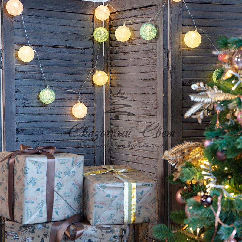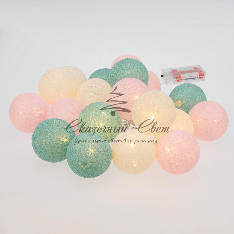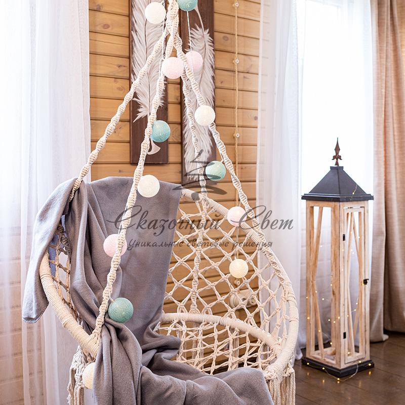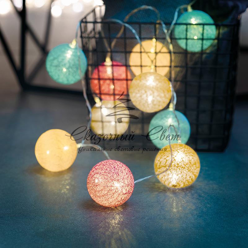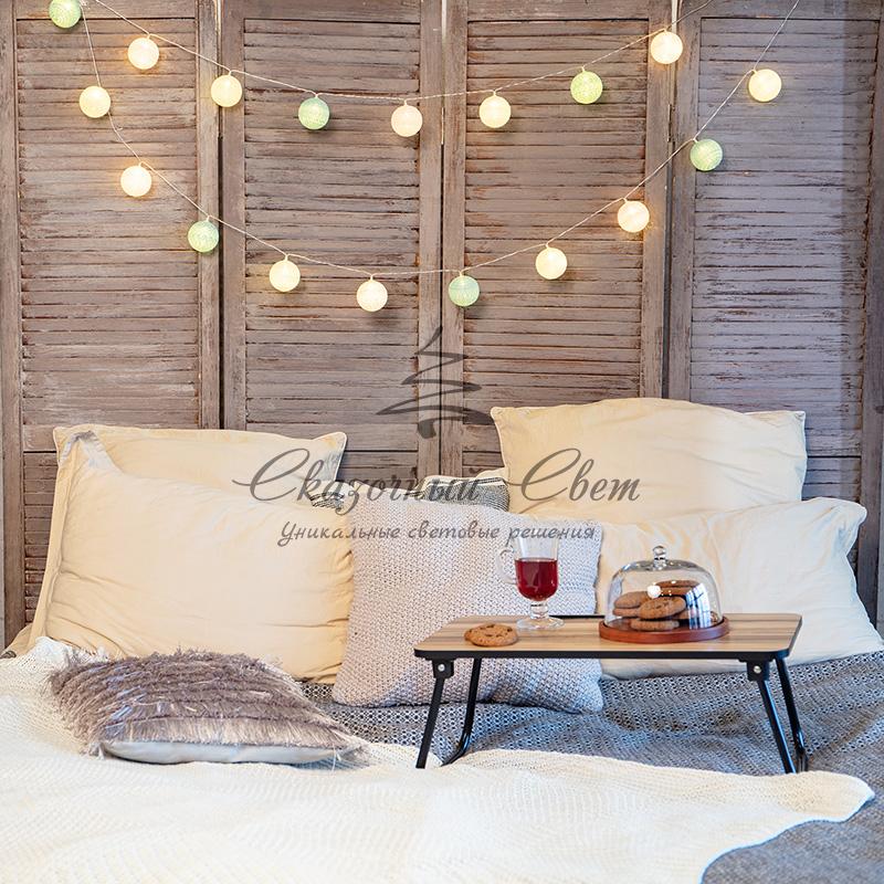 Тайские фонарики «Перламутр» — необычная светодиодная гирлянда длиной 3,5 метра, украшенная круглыми декоративными элементами в виде шариков, выполненных из хлопковой нити. Внутри каждого фонарика находится диод, излучающий теплый белый свет — всего в конструкции 20 диодов. Текстильный купол мягко рассеивает яркий поток, создавая уютное магическое свечение. Гирлянда, получающая питание от 2 батареек типа АА, поможет эффектно оформить карниз, гардину, спинку кровати, горшечное растение и любые другие интерьерные объекты, находящиеся вдали от розеток. Изделия на батарейках отлично подходят для украшения детских комнат благодаря безопасности использования.