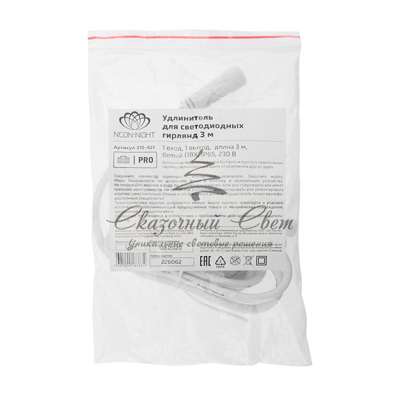 Удлинитель предназначен для быстрого и простого подключения гирлянд, расположенных вдали от розетки или друг от друга, а в сочетании с разветвителями позволяет всю декоративную иллюминацию аккуратно и быстро подключить к одной розетке. Вам больше не понадобится переплачивать за сетевые удлинители огромной длины, наблюдать страшную картину с огромным количеством запутанных проводов, и это не будет омрачать столь прекрасное настроение.